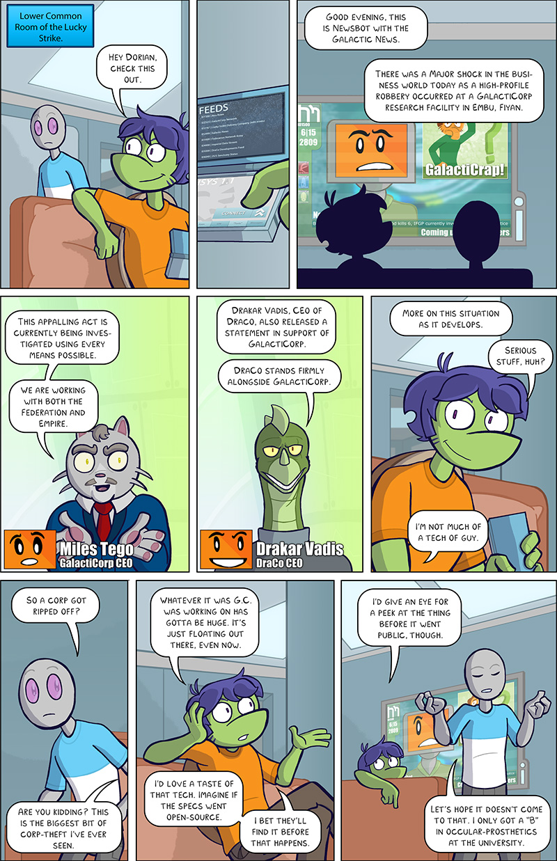 Newsbot: “Good evening, this is Newsbot with the Galactic News. Major shock in the business world today as a robbery was reported at a GalactiCorp research facility in Embu, Fiyan.”